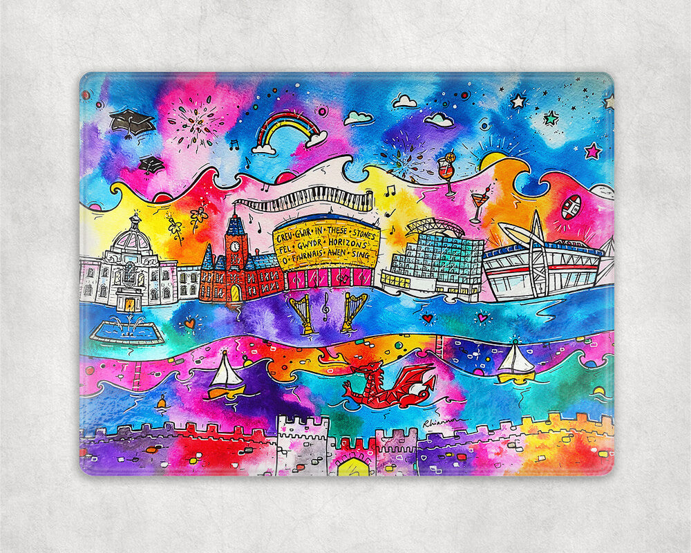 Cardiff City of Wonder Glass Worktop Saver ~ Bwrdd Gwydr Dinas Rhyfeddodau Caerdydd